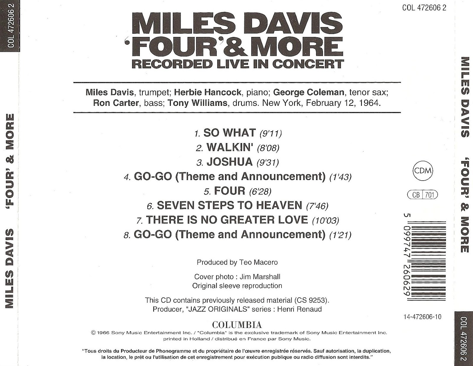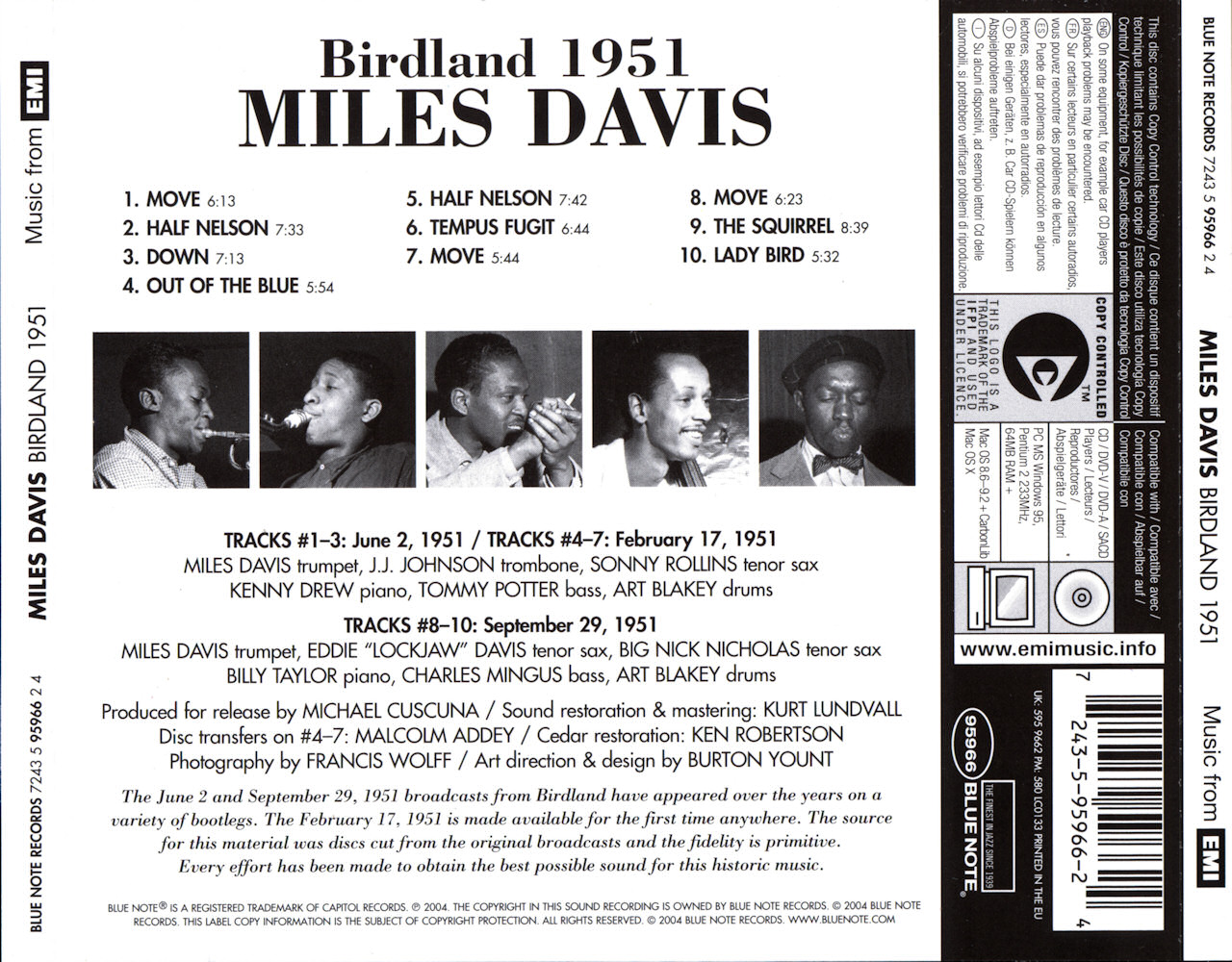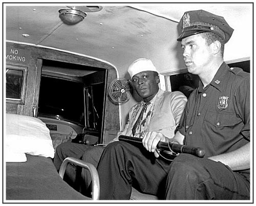 New York, fato registrado na West 54th Street Station House—18th Precinct. Photo: Bettmann / Corbis." Claro que, em sua autobiografia, Miles lembrou de maneira diferente: "Eu tinha terminado de fazer uma transmissão no Armed Forces Day, você sabe, Voz da América e toda essa merda, e estava acompanhando uma branca chamada Judy até o um táxi. Ela entrou e eu fiquei encostado na porta lá na frente de Birdland tomando um ar..