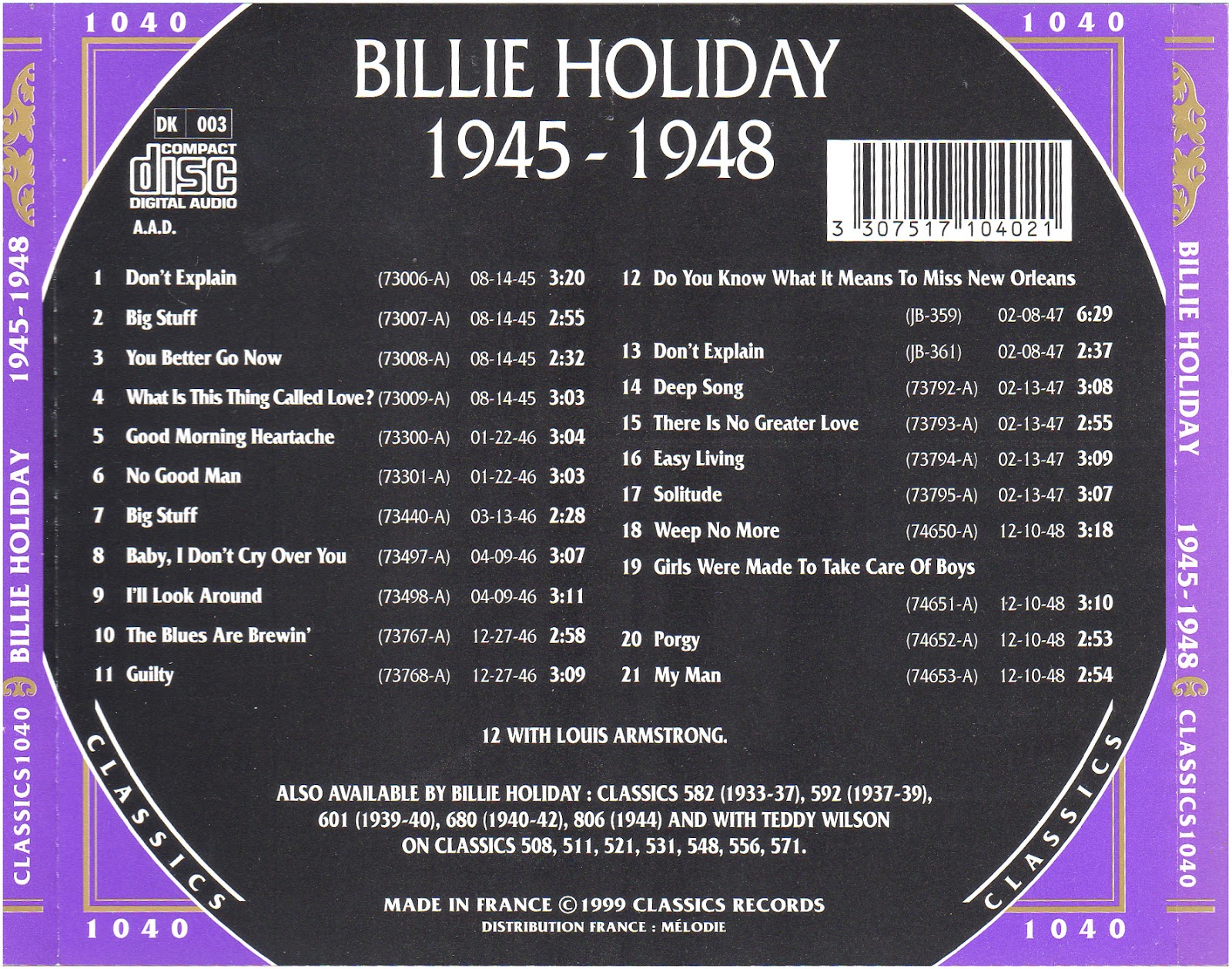 Billie Holiday (Vocal), Russ Case (Trumpet), Hykie Schertzer & Jack Cressy (Alto Sax), Larry Binyon & Paul Ricci (Tenor Sax), Dave Bowman (Piano), Carl Kress (Guitar), Haigh Stephens (Double-Bass), Johnny Blowers (Drums), Six strings and Toots Camarata conc. (arr) - Recorded in New York City, Wednesday, October 04, 1944. (Decca Records)