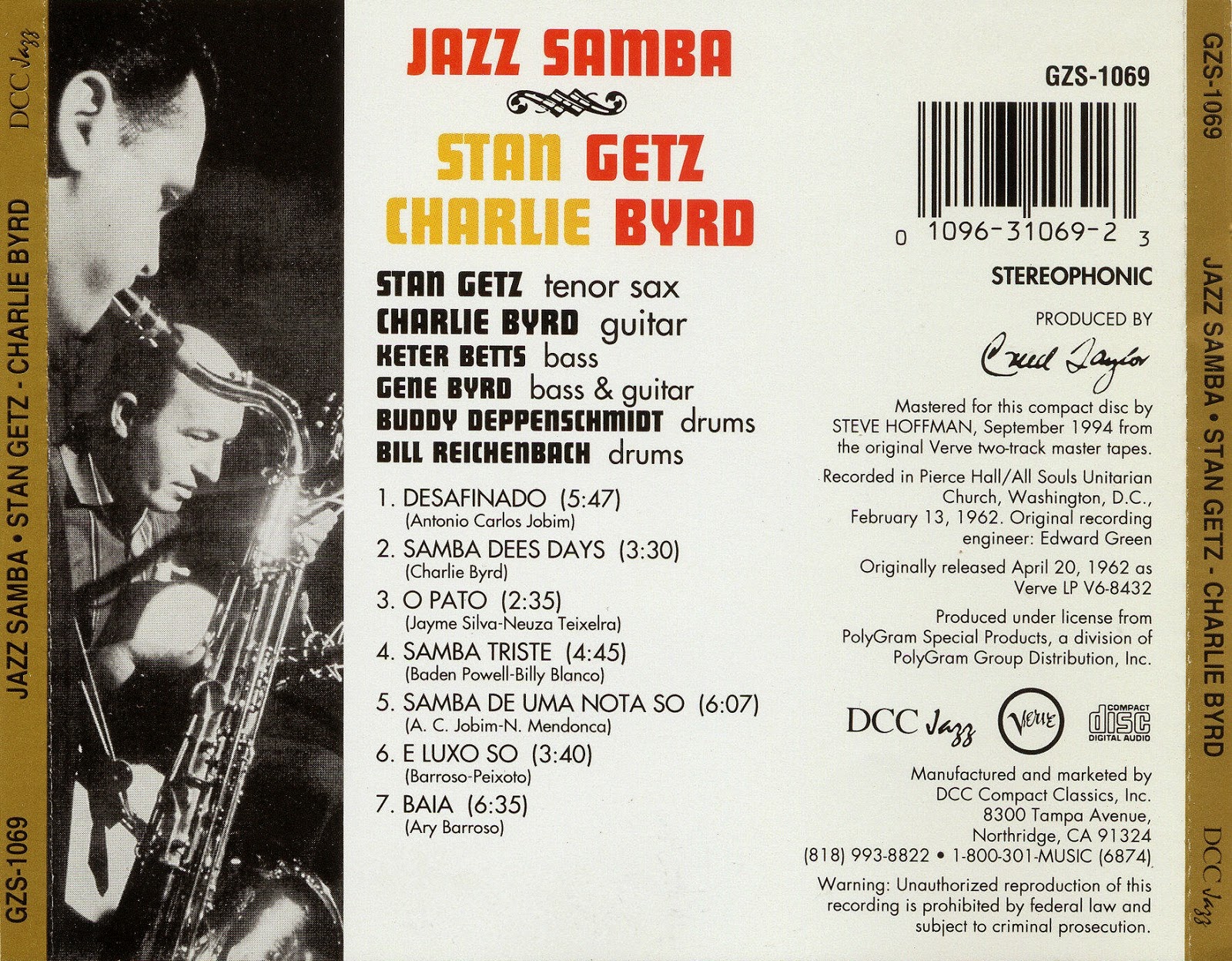 Stan Getz - tenor saxophone, Charlie Byrd - guitar, Keter Betts - bass. Buddy Deppenschmidt - drums, Gene Byrd - guitar, bass & Bill Reichenbach Sr. - percussion - Recorded February 13, 1962 & Released April 20, 1962